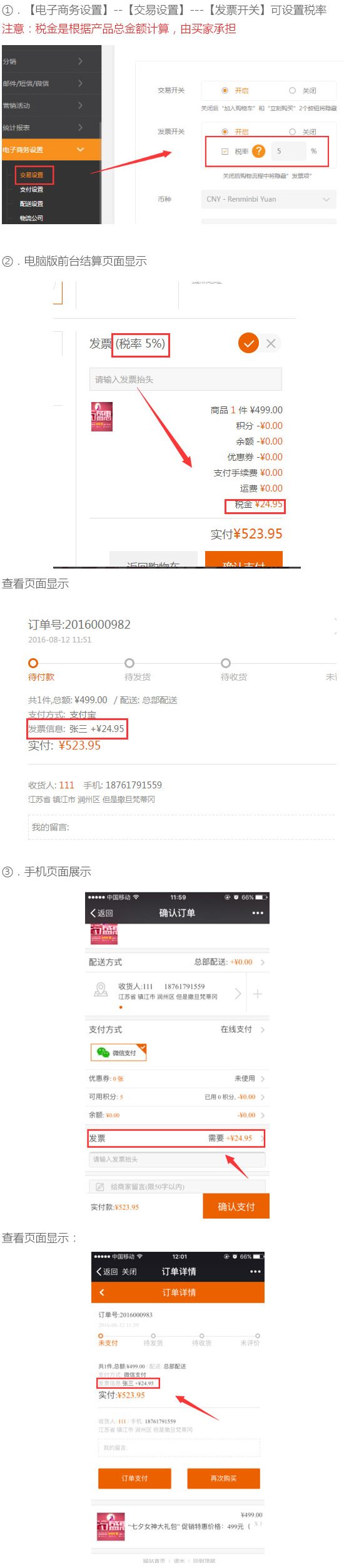 1.1后台:  "电子商务设置" —“交易设置” —“发票”—“电子发票收件箱”如下图所示: